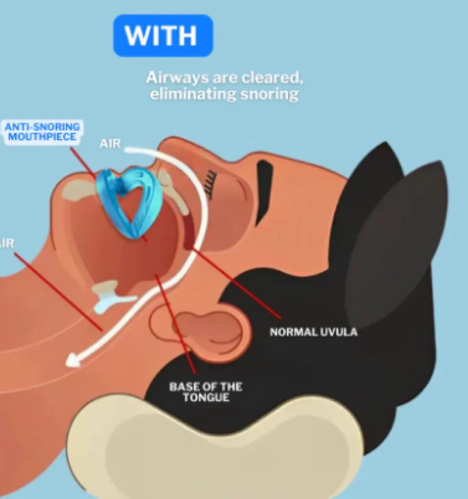 Snoring happens when the muscles in your throat relax during sleep, narrowing your airway and causing vibrations. The Lifegad Anti-Snoring Mouthpiece solves this naturally and effectively.