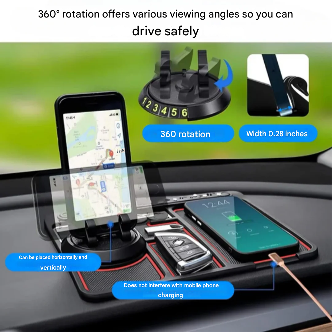 ✓ Dashboard Organization: A versatile 4-in-1 tool that functions as a phone holder, air freshener station, anti-slip mat, and license plate holder, keeping your dashboard tidy and clutter-free.